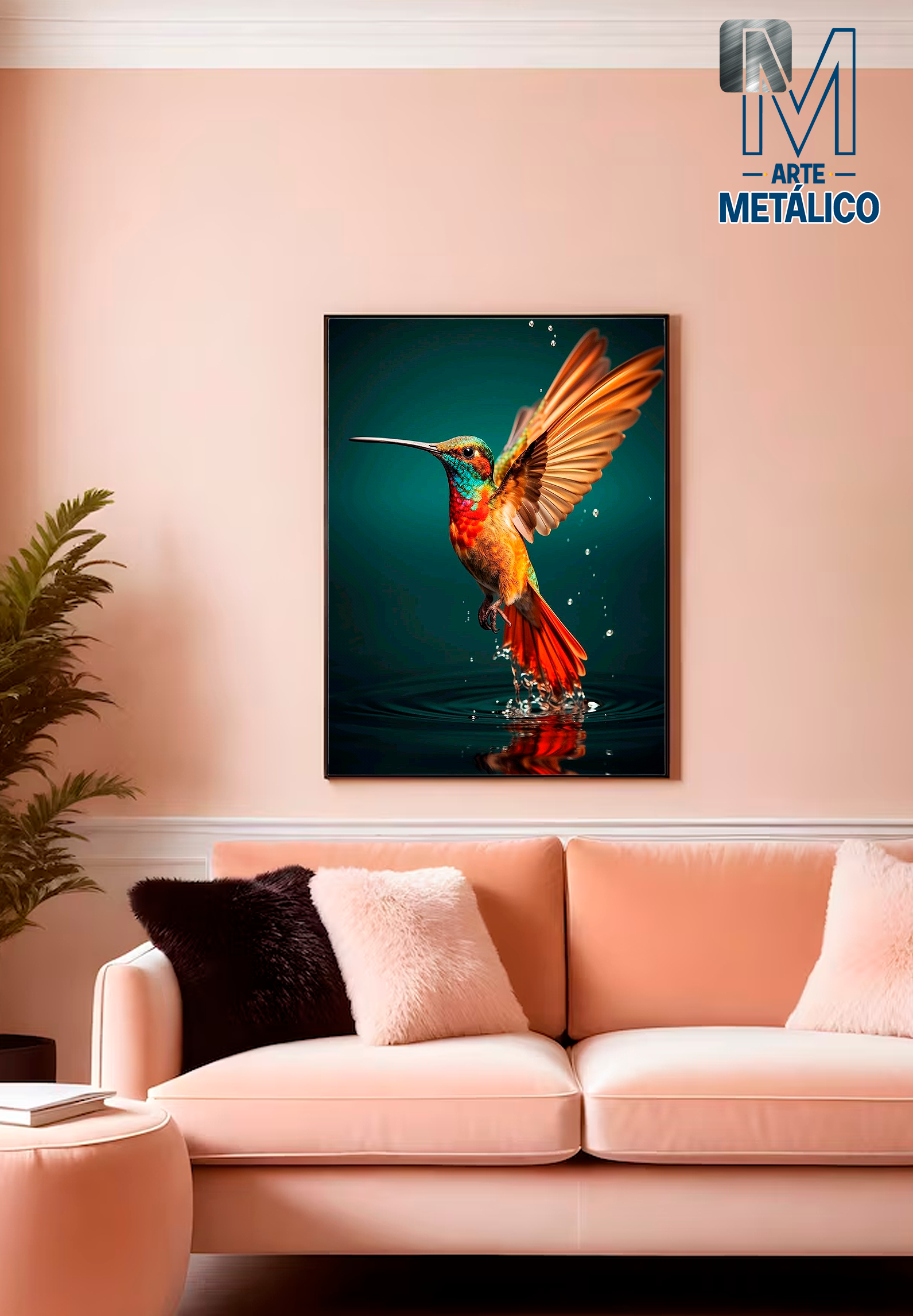 Cuadro metálico Colibrí en agua, medidas 42,8 x 33 cm