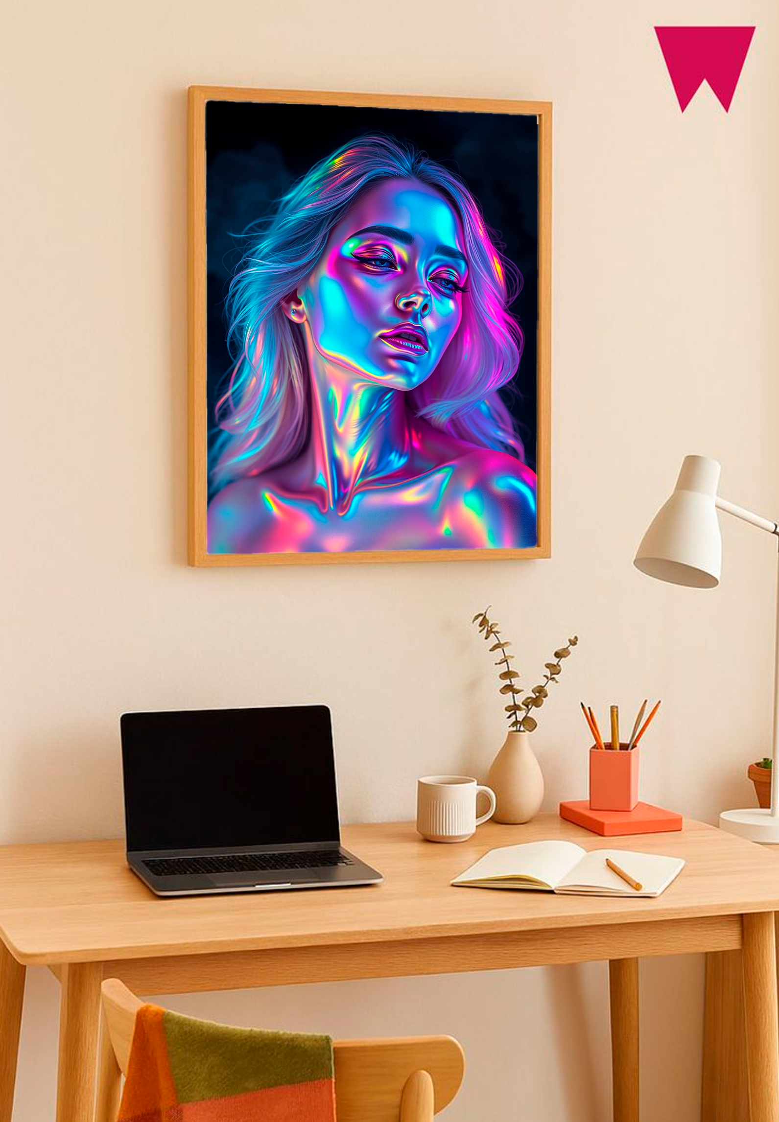 Agrega un toque a tus paredes con el cuadro metálico " Mujer Satín , medidas 42 x 33 cm